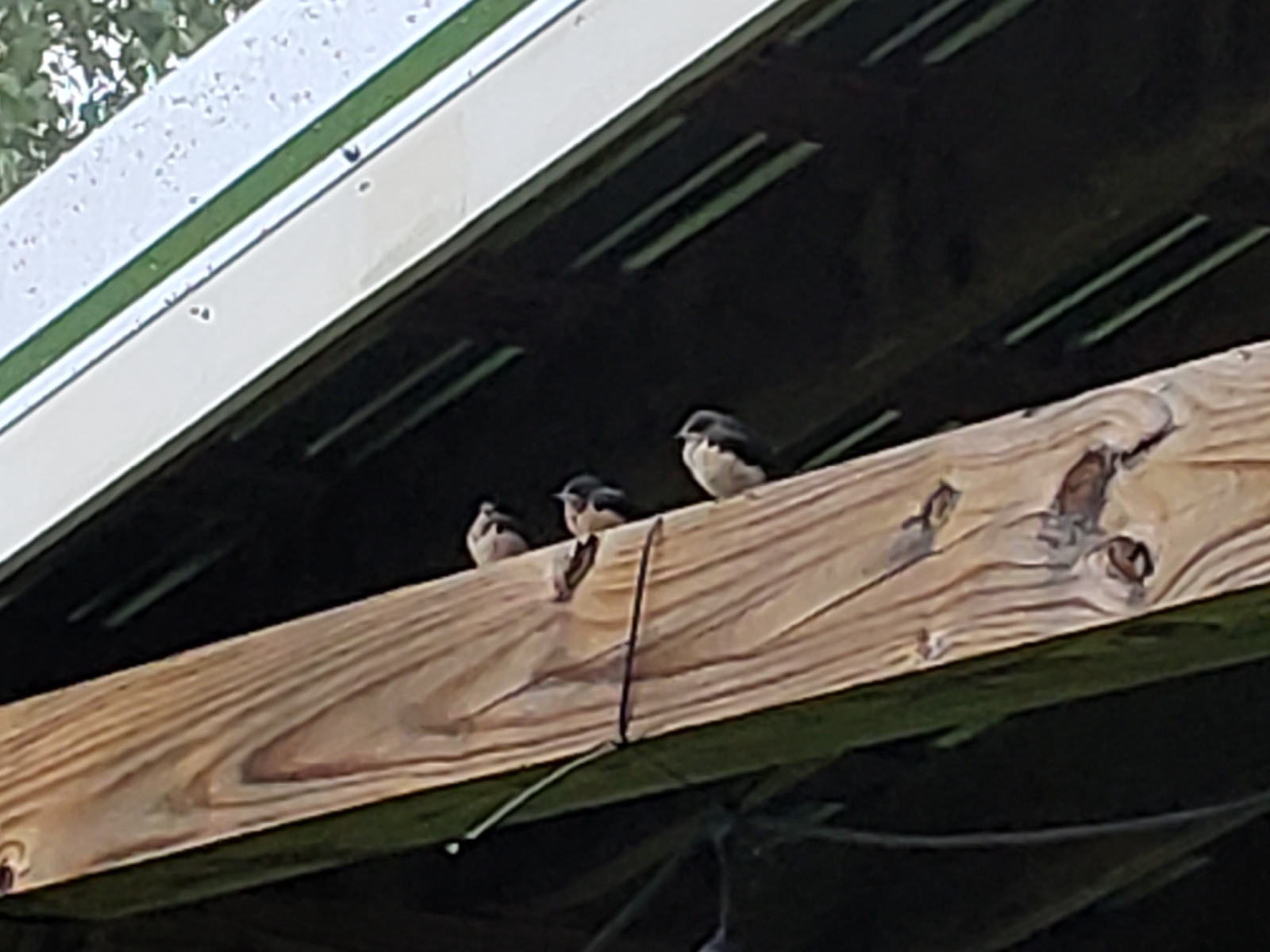 It is truly amazing to watch the first flights--there is sometimes one chick that's the dawdler and needs to be coaxed out by parents. They will all gather exhausted after that first flight on a beam or piece of equipment. They will return to the nest for the next couple days, by that time, barely fitting in the cramped space. Within days, the chicks are performing the amazing acrobatics the adult birds do as they catch their meals in flight, intersecting flying insects around the pond and in the barn. Shortly after, they are off for the next week or two and will return periodically. Once in awhile, the parents will opt for a second brood, and I wonder what becomes of the first brood?